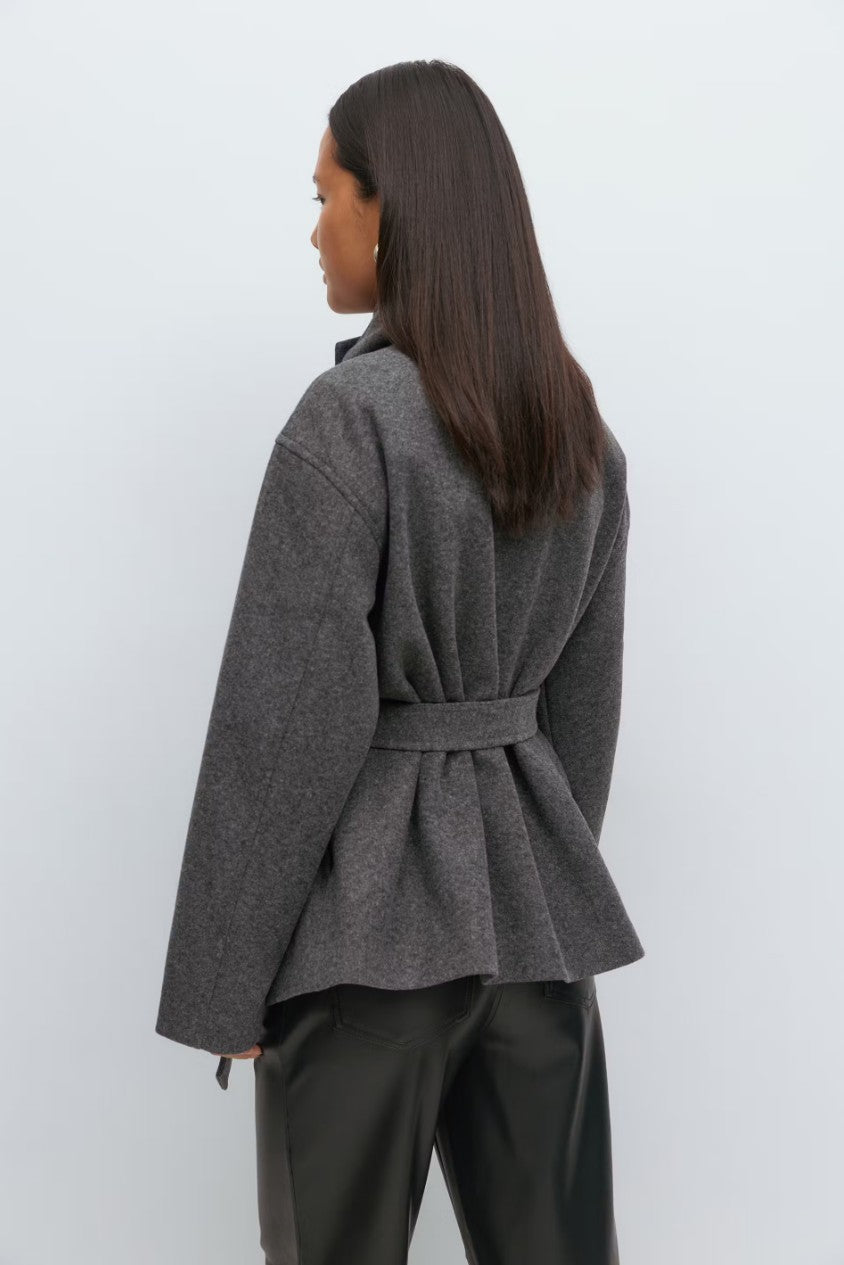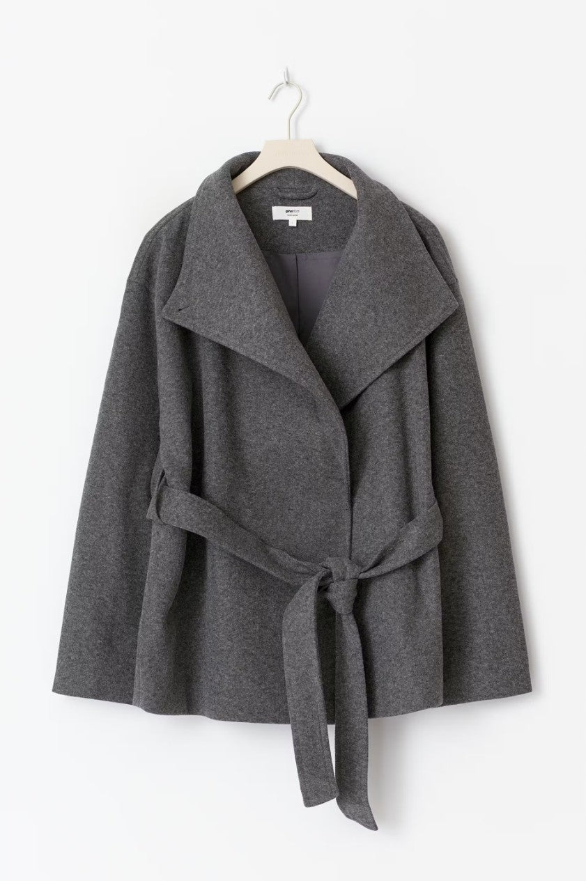 Kurzer Mantel mit Bindegürtel in der Taille. Der Mantel ist grau und hat Hoher Kragen. Er hat Zuknöpfen vorne, Taschen in den Seiten und normale Passform.