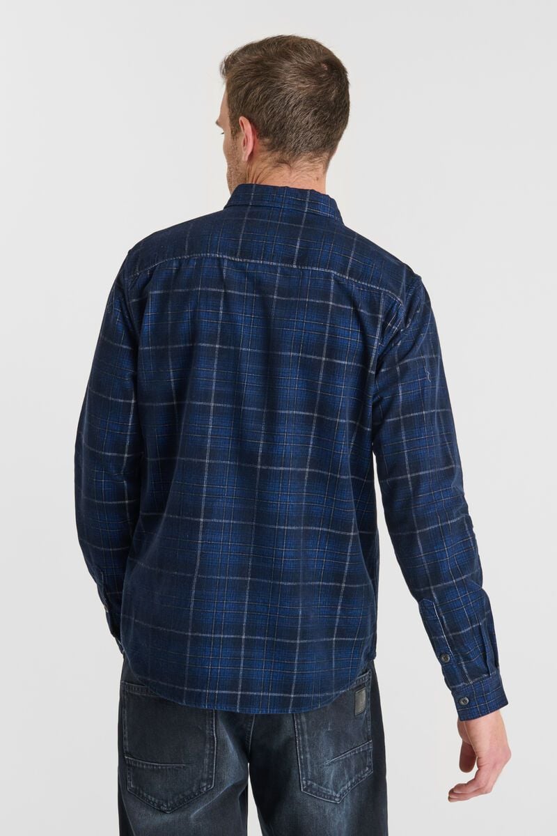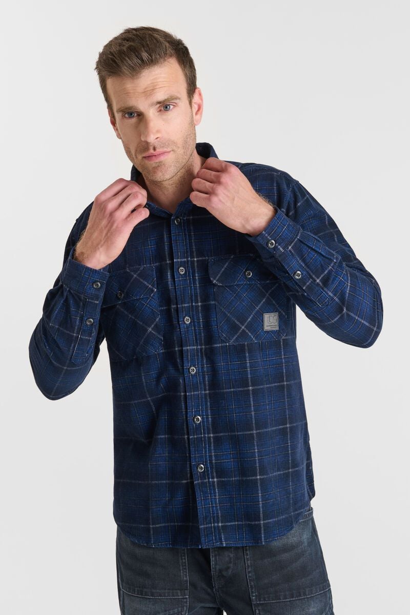 Blaues, kariertes Hemd aus Samt, Brusttaschen.