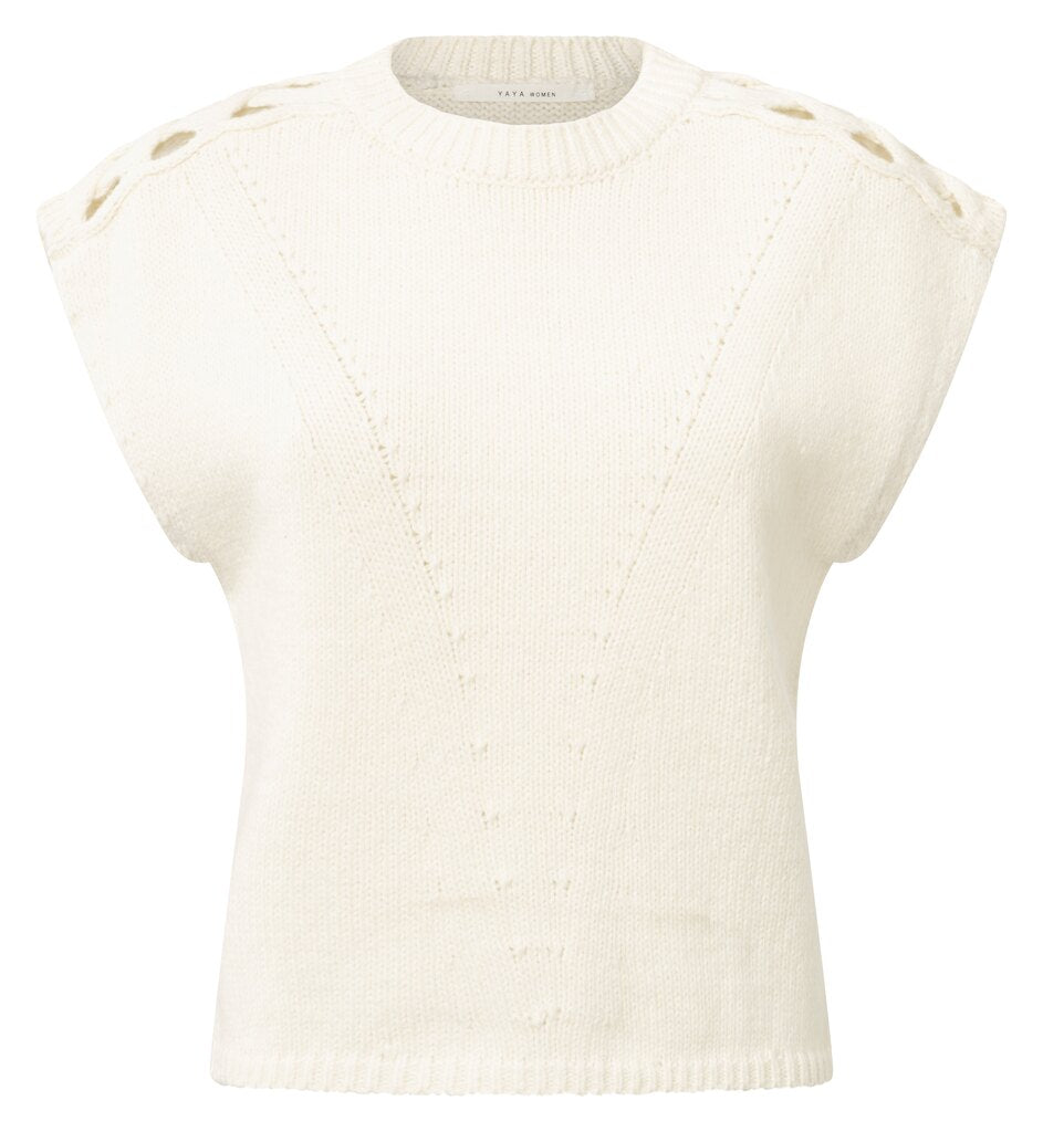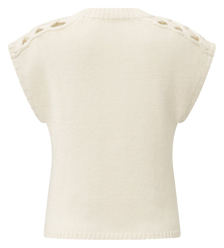 Dieser ärmellose Pullover ist aus einer weichen Wollmischung gestrickt und besticht durch raffinierte Zopfmuster an den Schultern. Der Rundhalsausschnitt und die gerade Passform bieten Komfort und zeitlosen Stil. Dezente Strukturakzente auf der Vorderseite verleihen dem Design Tiefe. Perfekt zum Tragen über einer Bluse oder allein zu Jeans.