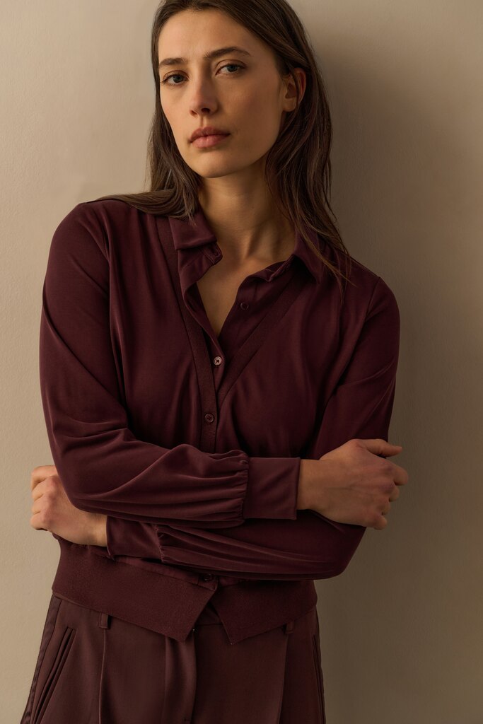 Diese stylishe Jerseybluse hat einen weichen Hemdkragen, lange Ballonärmel und eine durchgängige Knopfleiste auf der Vorderseite. Durch den Zwei-Lagen Look entsteht der Eindruck, es handelte sich um einen über einer Bluse getragenen Cardigan. Die gerippten Bündchen und der gerippte Saum sorgen für eine bequeme Passform. Ein raffiniertes Kleidungsstück, das deinem Look Tiefe und Charakter verleiht.