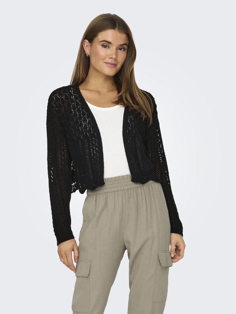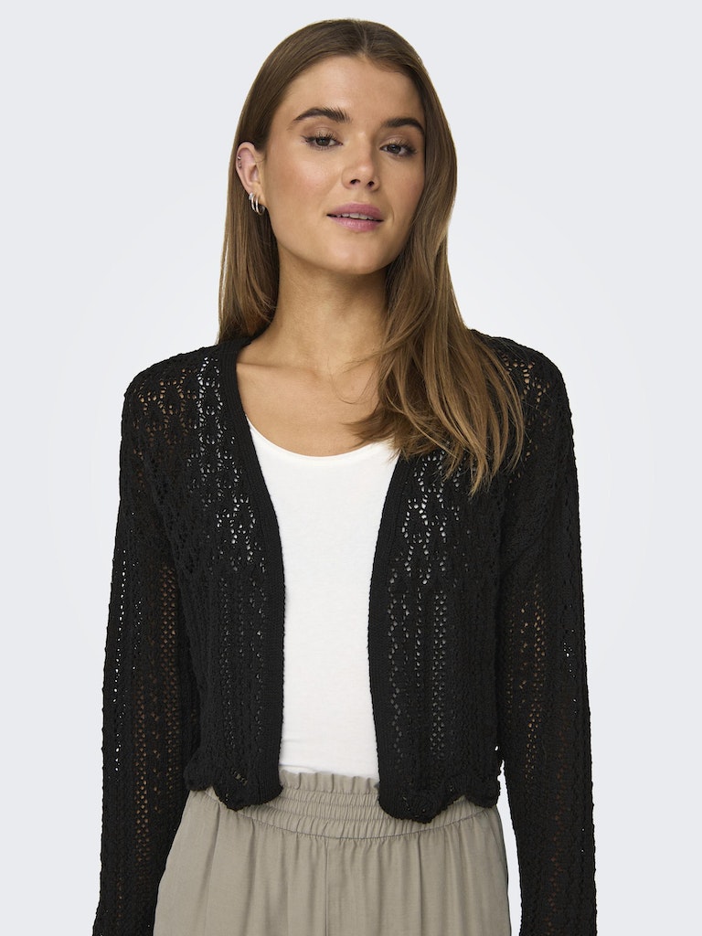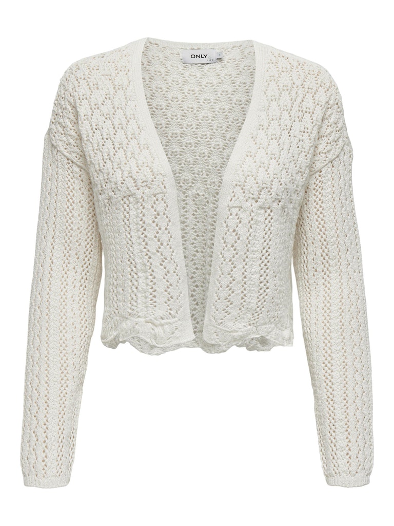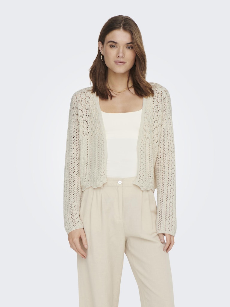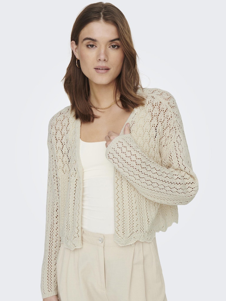 Vervollständige deinen Look mit einem zeitlosen, femininen Strickteil, das weich und warm ist. - Produkttyp : Strickjacke - Neck : V-Ausschnitt - Ärmel : 7/8 Arm - Ärmel : Tief angesetzte Schulter - Länge/Größe : Kurz - Details : Muschelsaum - Passform : Normal geschnitten